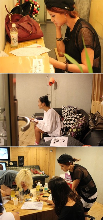 ヒョリ:レコーディングをした日です~録音に先立ち各自準備をしている姿です。私の後ろ姿もちらっと見えますね^^ 実力も良くて顔も心がけもとても美しいSPICA!何でも熱心にする子供たちだから、可愛がらないわけがない~!